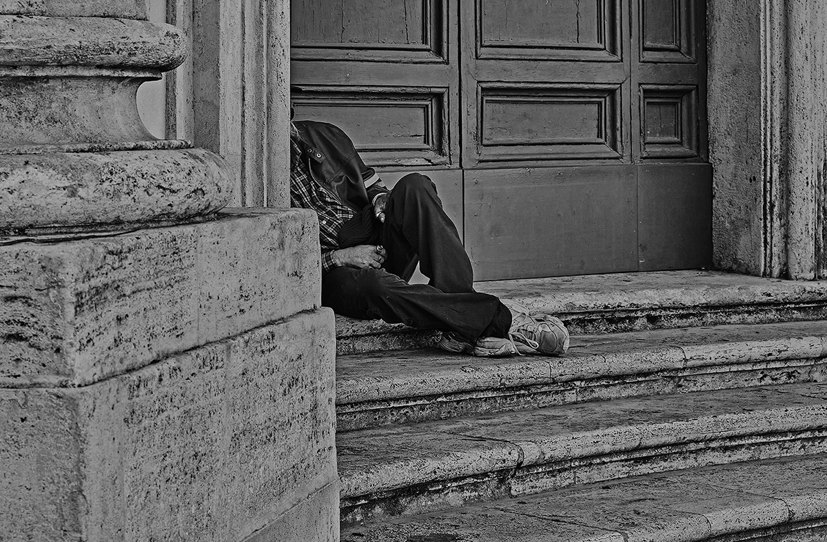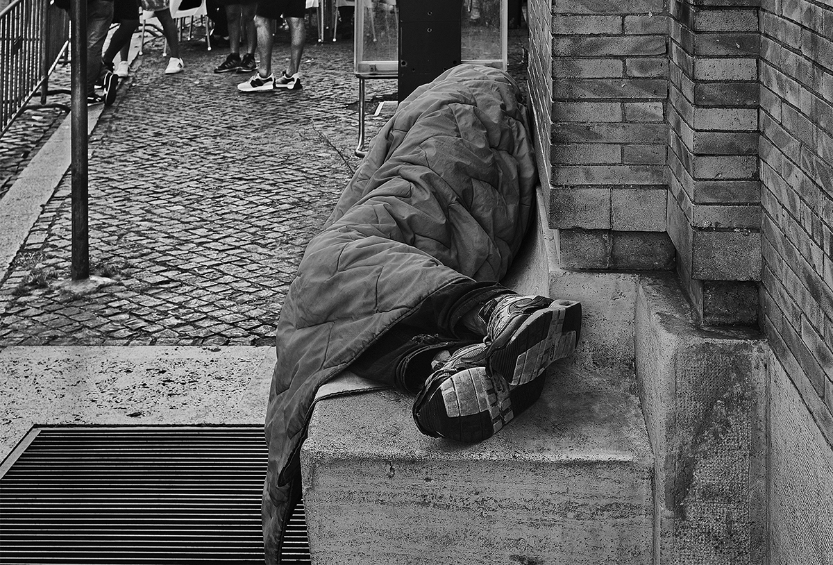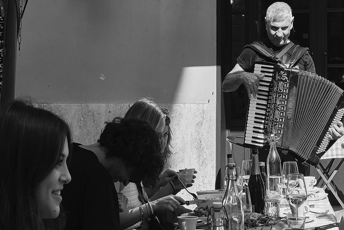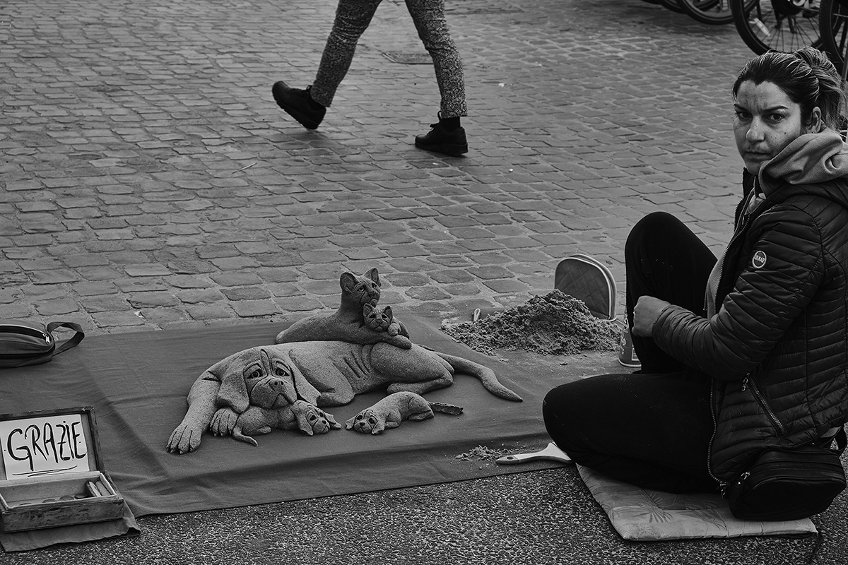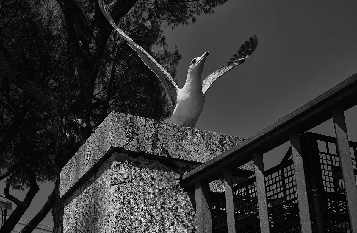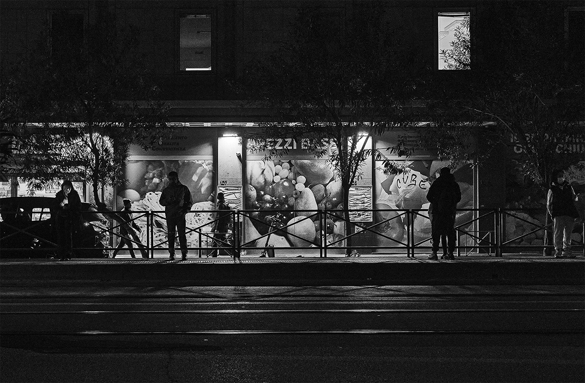 There is the precariousness of a nighttime wait or that of a sulphurous accordion player, the soaring of a seagull or a bucket that seems precariously leaning on a broom, someone making sand sculptures for passers-by and glaring at the photographer, or someone sleeping on a bench and only the soles of his jogging shoes can be seen like the feet of a poor Christ.