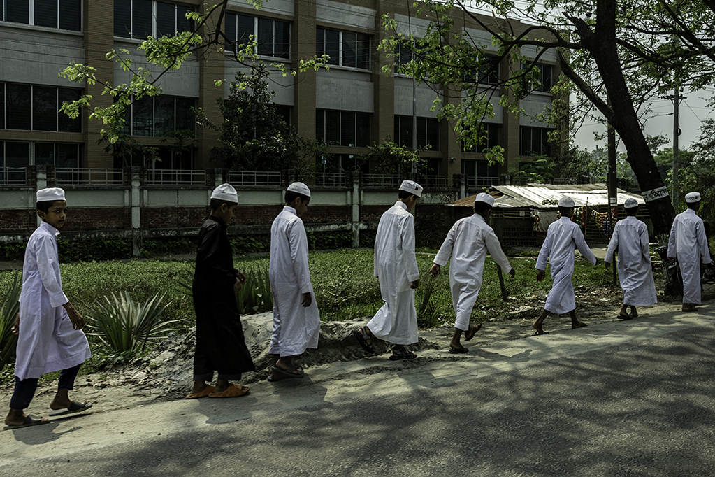 A line of madrasa students walks in silent formation — uniformed, and obedient. They follow their teacher through a familiar path, but their eyes do not wander with curiosity; instead, they lower with the weight of routine. There is no resistance. No divergence. Only the fear of what might happen if they step out of line.