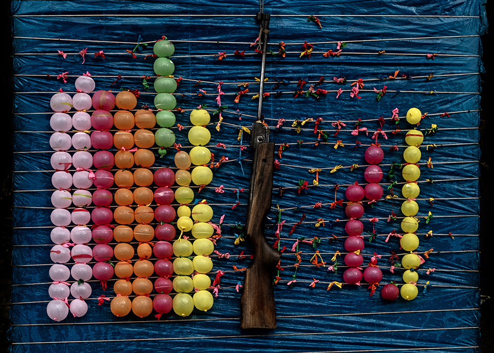A wooden air rifle rests silently against a wall of bursting color — rows of delicate balloons, suspended in stillness, waiting to be popped in play. At first glance, it’s just a carnival game — bright, harmless, and fleeting. But look closer, and it reveals something deeper: a disarmed metaphor in a world that rarely lets its weapons rest.