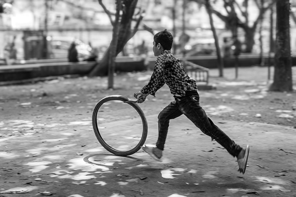 In the heart of Bahadur Shah Park, a child runs — barefoot, breathless, free. With a stick and an old rickshaw tire, he creates a universe of his own. The world may see a symbol of poverty; he feels only motion, rhythm, and wind. The spinning tire becomes his sun, his dream, his world — circling endlessly under a patchwork of light and shadow.
