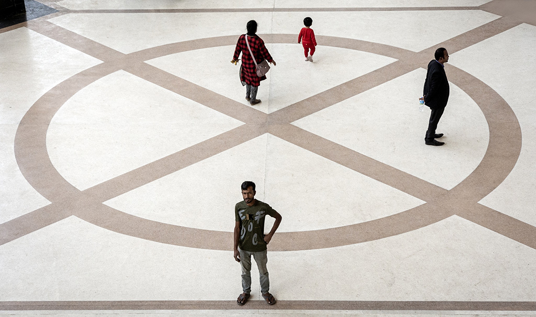 In this meticulously ordered frame, geometry becomes metaphor. The intersecting lines on the floor, precise and symmetrical, seem to promise connection—yet the people within them remain detached, orbiting their own invisible worlds.