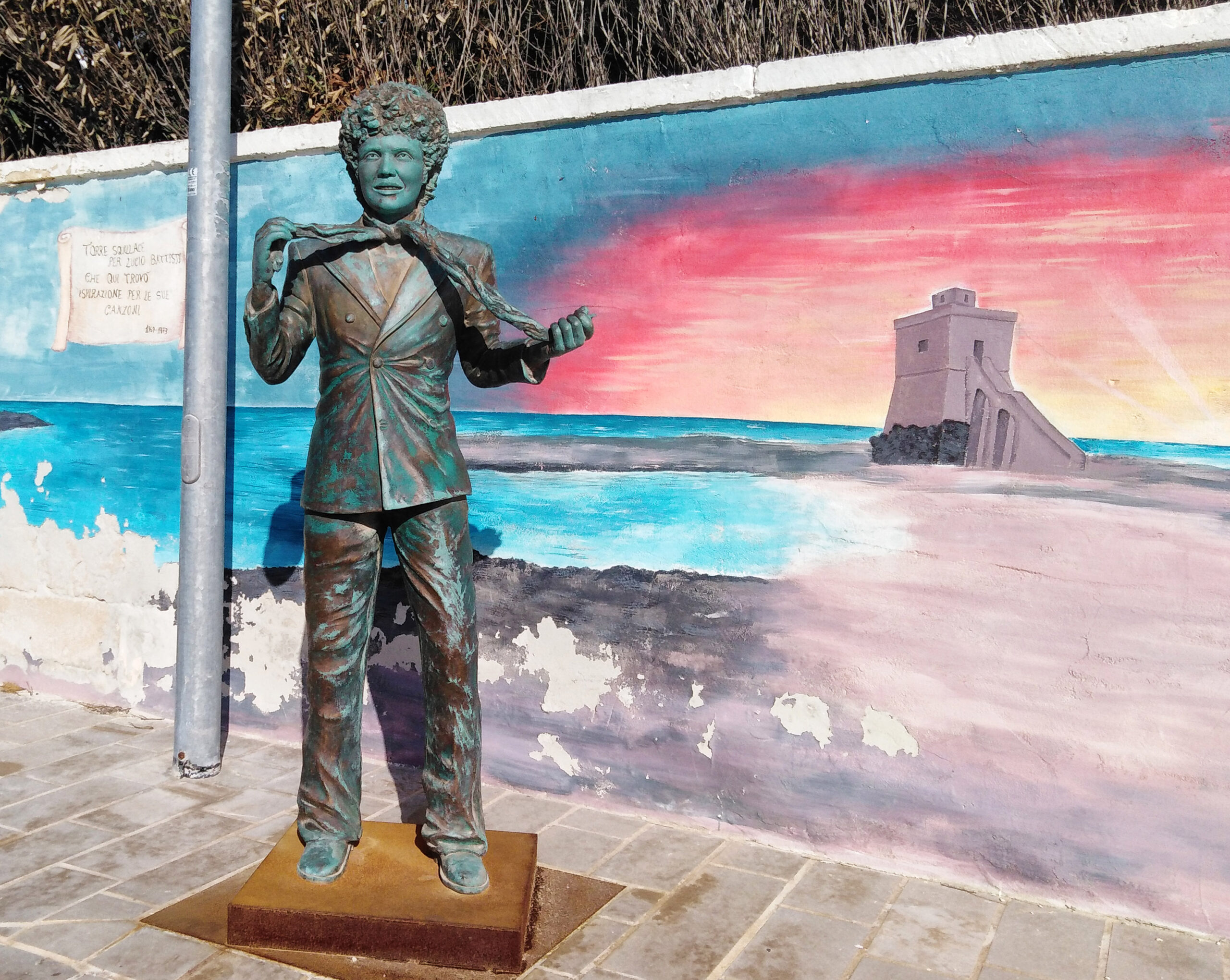 In remembrance of those significant days, a bronze statue of Lucio Battisti, commissioned by the Municipality of Nardò and designed by Dario Tarantino, has been erected in front of Mogol’s villa, which often hosted the illustrious singer-songwriter. The statue is located outdoors along a public waterfront promenade, ensuring that anyone visiting Torre Squillace can admire it without entering private property. Mogol’s villa is positioned near the Torre Squillace coastline, within the municipality of Nardò, situated between Sant’ Isidoro and Porto Cesareo.